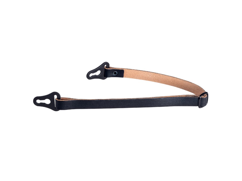 Robustní kožený podbradní pásek s plastovými oky a kovovými nýty.